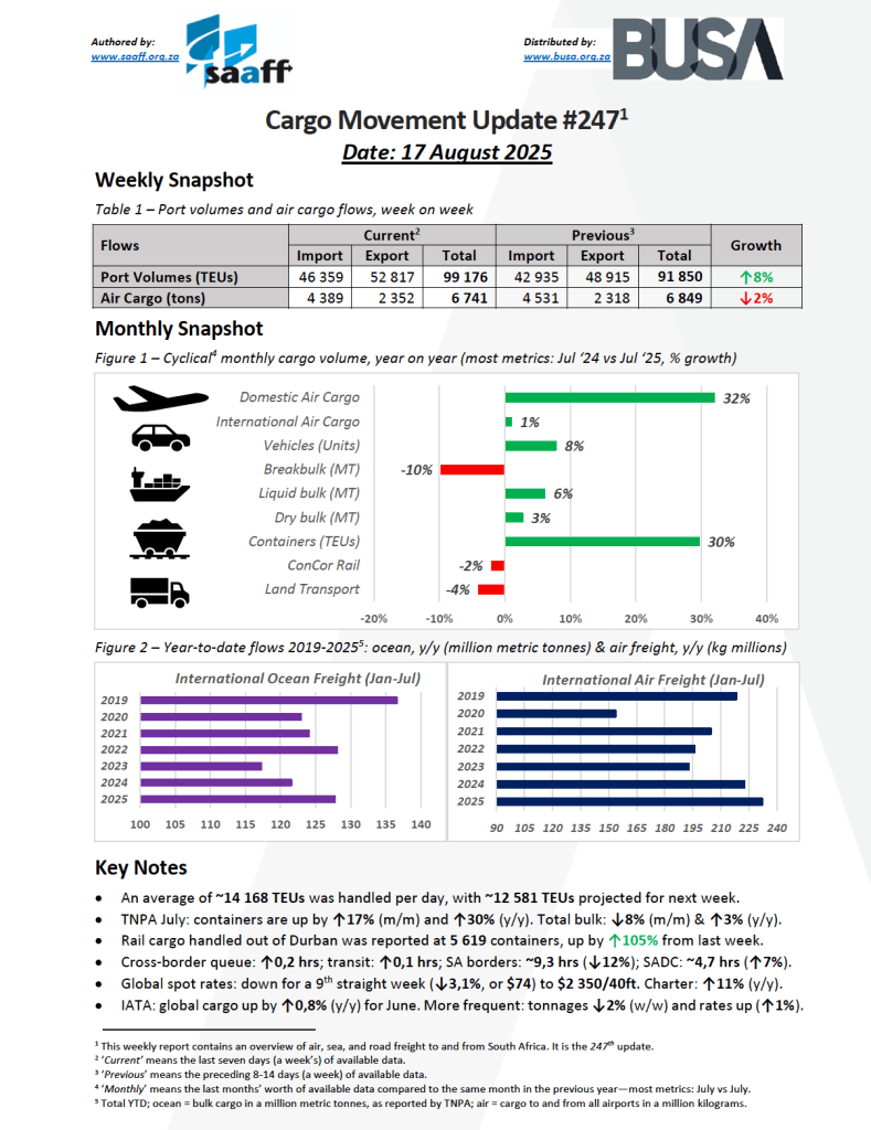 b. Year-to-date container throughput is now +0,3% above 2024 levels and only -2,1% below 2019 – a pre-pandemic baseline that signals how close South Africa is to a full return to normality. And the subsequent weeks’ throughput has continued to be high – which is encouraging for the full-month August numbers to follow.
