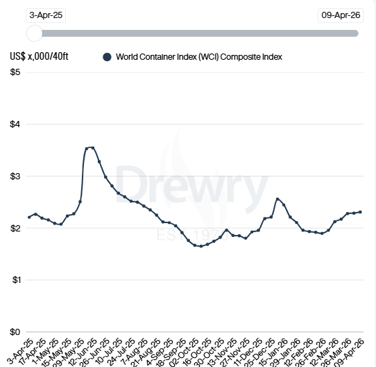 - Freight rates stabilising at elevated levels: The Drewry World Container Index remains around $2,300 per 40ft container, indicating that the market has absorbed recent disruption.