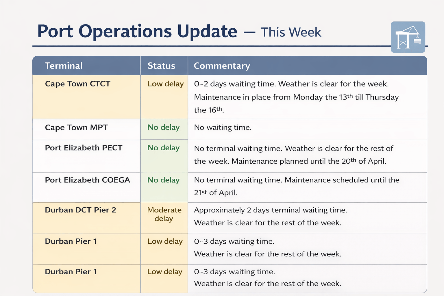 Airfreight demand softening while rates remain firm: Global volumes are flat to slightly down, but rates remain elevated due to higher jet fuel costs. - Port performance stable but volumes lower this week: South African container throughput declined week on week, reflecting timing and reporting factors rather than congestion.