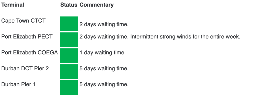 Locally, while port performance is improving, peak season pressure is being felt. Durban is currently experiencing vessel waiting times of around five days, and transporters are reporting extended delays to load or offload cargo. In Cape Town, trucking delays of up to five hours are being reported, even with prior booking.