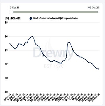 Drewry’s World Container Index fell another 1 percent this week to $1,651 per 40-foot container, its 17th straight weekly decline and the lowest level recorded since January 2024.
