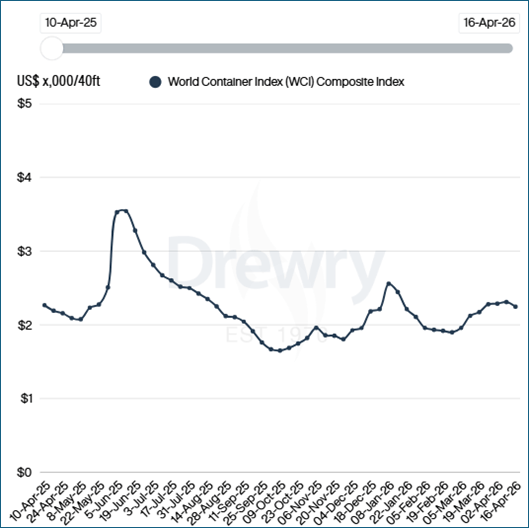 Drewry’s World Container Index softened slightly this week, decreasing to approximately $2,246 per 40ft container. This confirms that while rates remain elevated, the market is not currently accelerating, with pricing being supported by cost rather than demand growth.