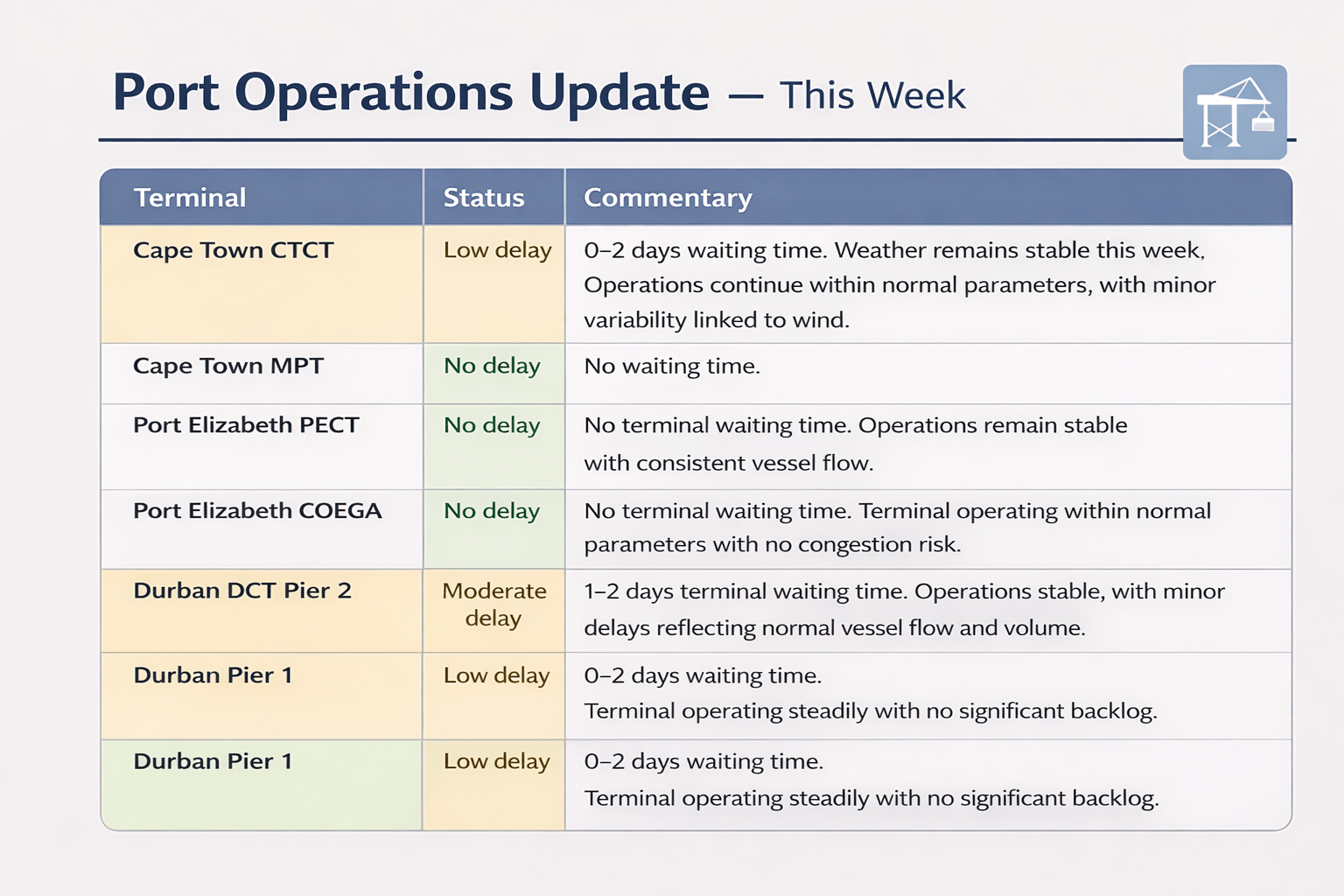 - Port performance stable as volumes increases: South African ports continue to operate within normal parameters, with no major congestion reported as export volumes build.